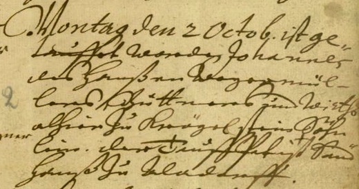 Montag, den 2 Octob. ist ge=tauffet worden Johannes des Hanßen Weyermül- lers Büttners und Wirths alhier zu Krögelstein Söhn= lein. Der TauffPat ist Sand Hanß